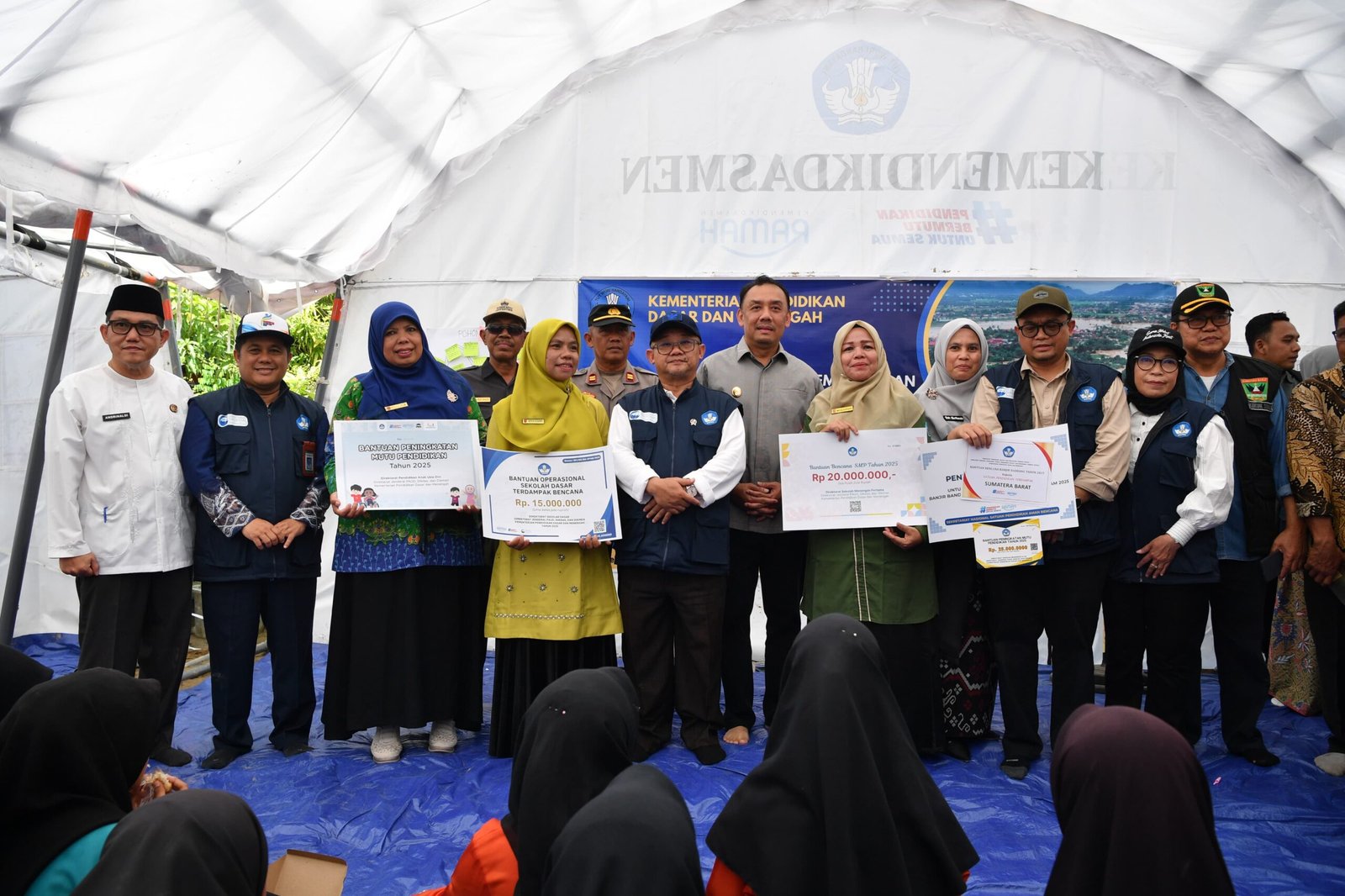 Bantuan tahap awal yang diberikan di Sumbar terdiri atas 1.500 paket _school kit_ untuk jenjang PAUD hingga SMA/SMK, 100 paket _family kit_ untuk guru, paket sembako, serta 25 tenda sekolah darurat. Dua tenda telah berdiri dan digunakan sebagai ruang belajar sementara, sementara tenda lainnya akan didirikan sesuai kondisi lokasi. Kehadiran tenda darurat diharapkan dapat mempercepat kembalinya pembelajaran tatap muka di daerah terdampak.