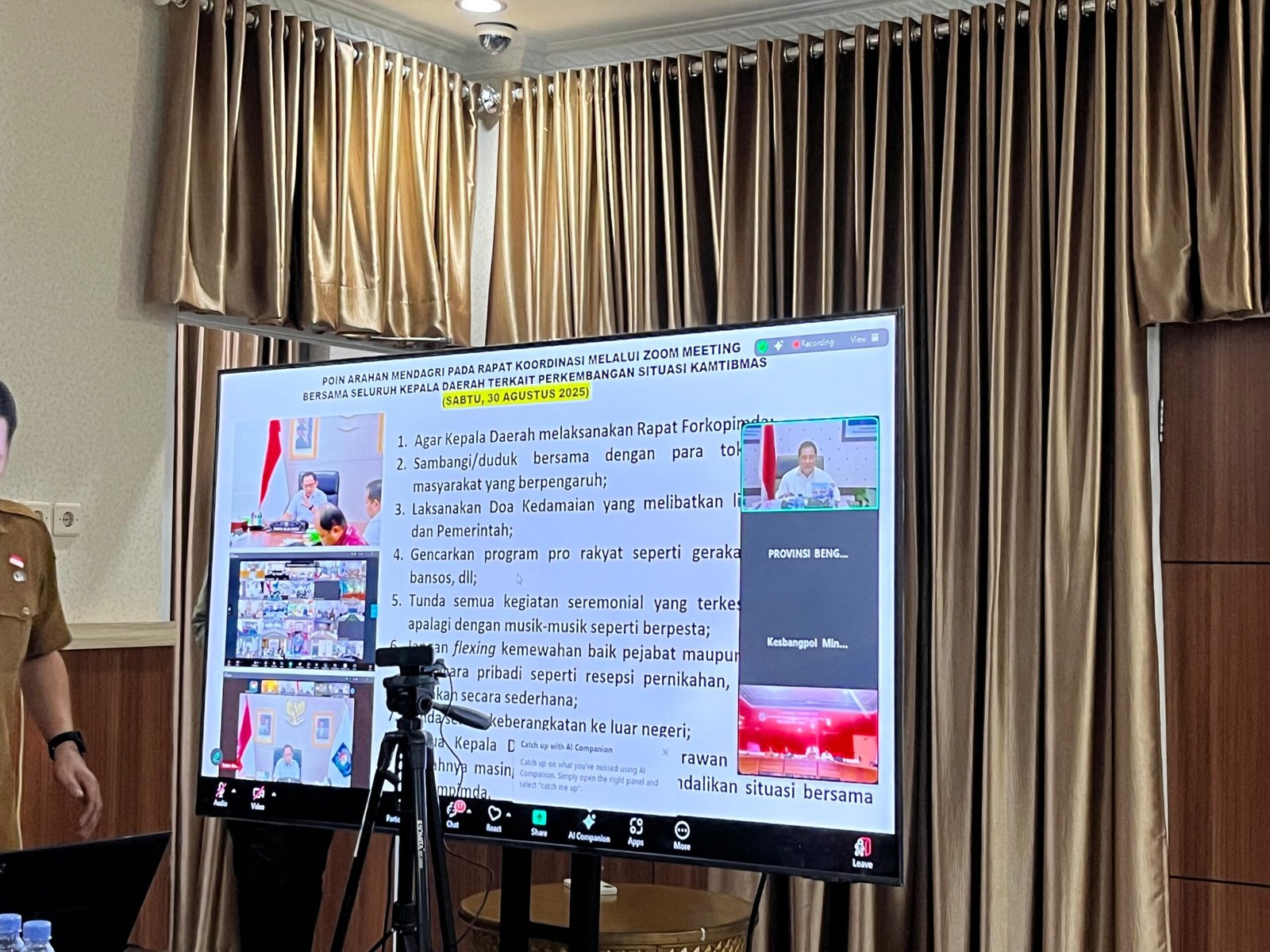 Bengkulu, – Penjabat Sekretaris Daerah Provinsi Bengkulu, Herwan Antoni, mengikuti Rapat Koordinasi (Rakor) Dukungan Stabilitas Sosial dan Politik Daerah melalui Zoom Meeting di Ruang Sekretariat Daerah Provinsi Bengkulu, Selasa (2/9).