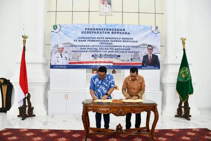 Bengkulu, – Pj Walikota Bengkulu Arif Gunadi melakukan Penandatanganan Kesepakatan Bersama antara Pemerintah Kota (Pemkot) Bengkulu dengan PT Bank Pembangunan Daerah Bengkulu tentang Penggunaan Layanan Perbankan Elektronik dan Digital dalam Pelaksanaan Anggaran Pendapatan dan Belanja Daerah di Balai Kota Merah Putih, Kamis (1/2).